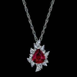 In its purest form, the mineral corundum is colorless. Trace elements that become part of the mineral’s crystal structure cause variations in its color. Chromium is the trace element that causes ruby’s red, which ranges from an orangy red to a purplish red.